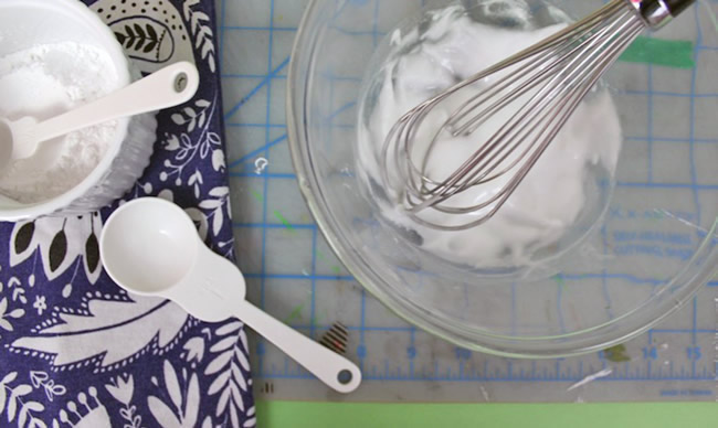 In your mixing bowl, combine the baking soda with the vinegar. Revel in the wonderfully fizzy reaction between the two. Once that's calmed down, add the corn starch and corn syrup. Whisk until smooth.