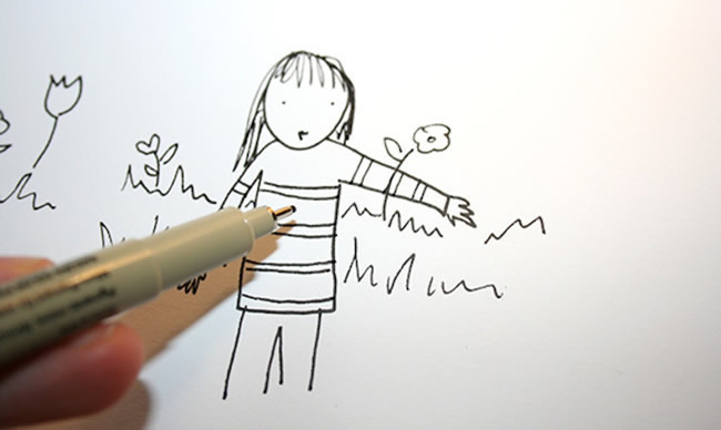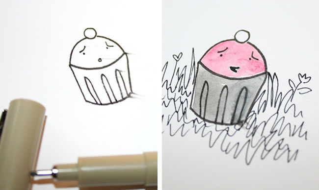You didn't let the pen ink set for a few minutes before erasing the pencil lines, so it smeared. Or, you let your hand rest on an inked area while drawing another portion, then pulled it away too quickly, ending up with a big smudge. But never fear! You can cover up the damage by adding other elements to your drawing, like a background or color.