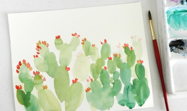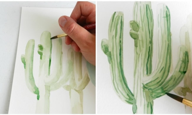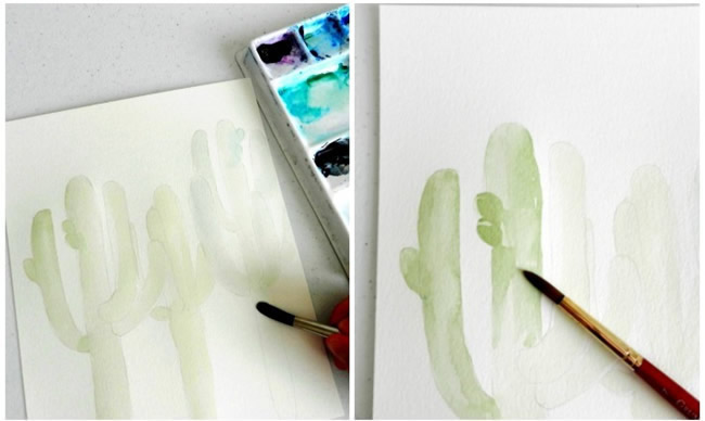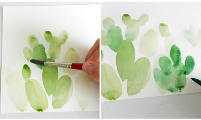 Using a medium round brush, apply a very light wash with watercolor paints. It's OK if you leave a little white space here and there. To add some variety, paint each cactus a different shade of green by mixing different amounts of yellow and blue . Let this first layer of paint dry slightly, then apply a second layer of green paint where you want there to be shadows or darker spots.