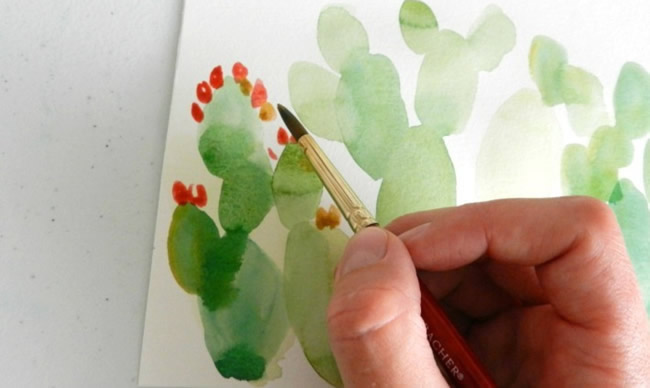 Now it's time to add on some prickly pear fruit! Using reds, yellows, oranges and pinks, paint small oval-shaped fruits on the tops of the plants. Use a smaller brush for this step.