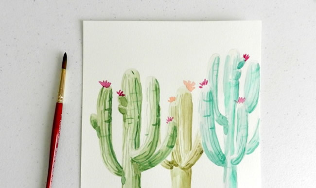 To add depth to your painting, paint lighter colored cacti in the background and darker colored ones in the front — this is easily done by changing the paint-to-water ratio . These different values give your painting some perspective.
