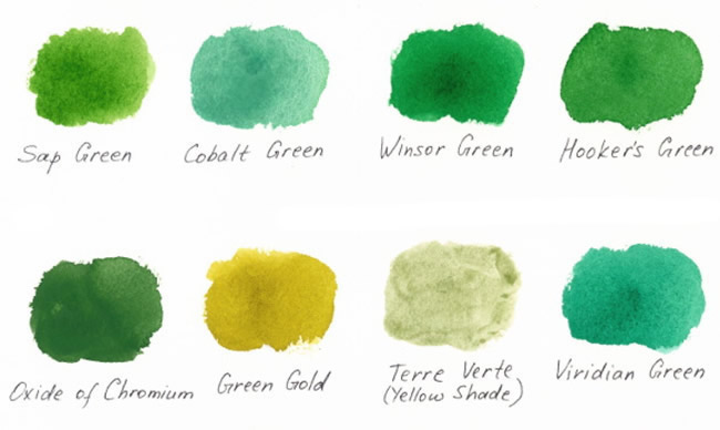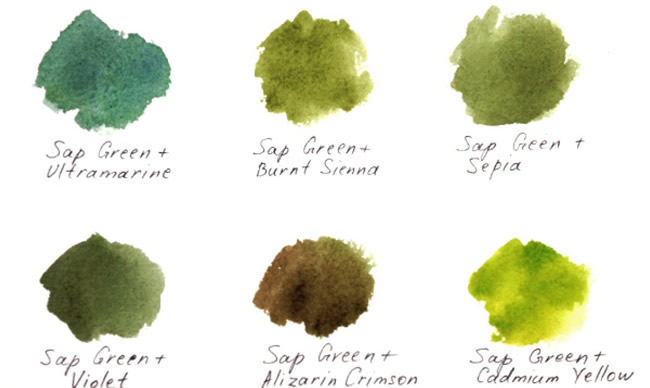 Most of the time, however, you'll want to use the tube green as a base and mix in other colors. You'll be surprised what a big different this technique makes! Sap Green, for example, looks natural and gorgeous when combined with other hues. Check it out:
