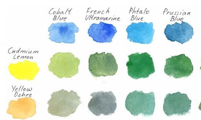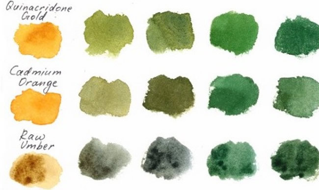 You probably remember this formula from elementary school art class: Mix yellow and blue to make green. Easy peasy! True, it's a touch more complicated if you want to make a selection of natural shades. The keys are to play around with different shades of yellow and blue (try anything from Cadmium Lemon to Burnt Umber for yellow, for example), and different ratios of each pigment. It's really helpful to reference a standard color chart when you're making greens, and even to create your own chart once you develop some shades you love.