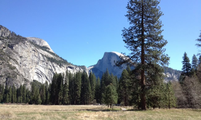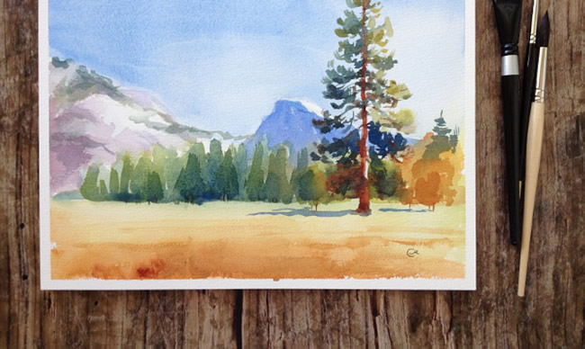 As a reference, I'll use this photograph from my visit to Yosemite National Park. The mountain behind the big tree is the famous Half Dome. I took the picture in the spring, but decided to paint an autumn scene instead.