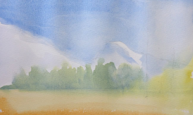Apply a few brushstrokes defining the trees in the background, using the mixture of cobalt blue and yellow ochre.