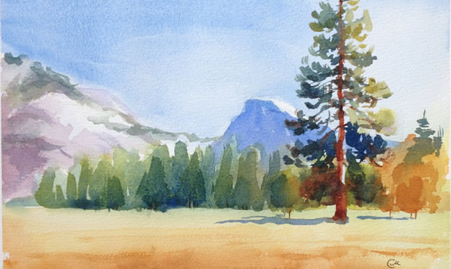 Paint the mountains using cobalt blue, winsor violet and burnt sienna in various combinations. Note that with this position of the sun, Half Dome's vertical wall is largely in shadow.