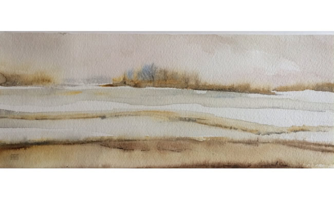 Blue summer skies and starry watercolor night scenes are fun to paint, but dreary days deserve some love, too. Think of a snowy day, the pearly light of a cloud-covered sun illuminating the horizon. How about a November morning with drizzle so fine it tints the air with silver mist?