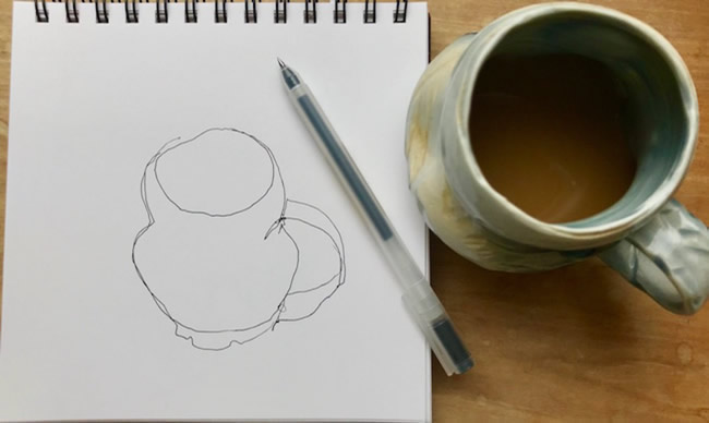 This exercise trains our eyes and hands to work together, and it really beefs up our observational skills. I do these every single day and I choose any old subject that's nearby, which is often my coffee mug or my breakfast. I draw my cat a lot too, so don't overlook a pet as a possible subject.