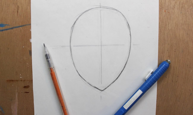 Draw an oval for the head and then draw the neck. Put some guidelines where the nose and eyes would be.