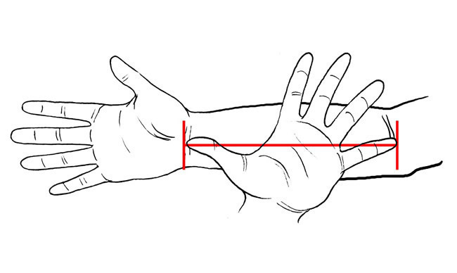 When you spread your fingers, your hand is wider than it is long. In fact, its width is about the same as the distance between the inside of your elbow and your wrist.