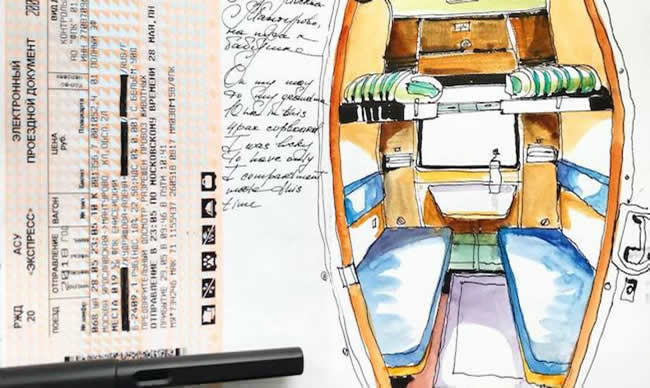 Alena Kudriashova mixes drawings with with collage materials in her work (think: coffee cup sleeves and ticket stubs). This mixed-media approach makes her work a bit like a travel journal, and makes her sketchbook spreads almost 3-D.