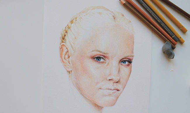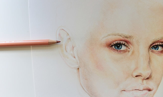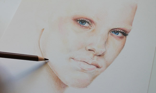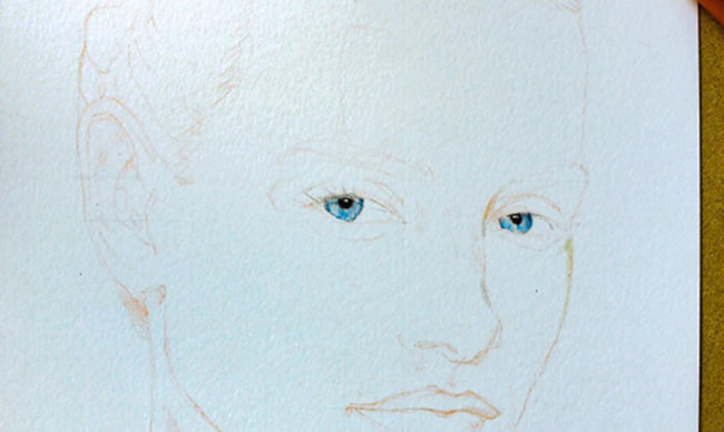 After a few rough drafts, start on the real sketch. Draw in the details of the facial features. Then outline the face with a medium flesh-colored pencil.