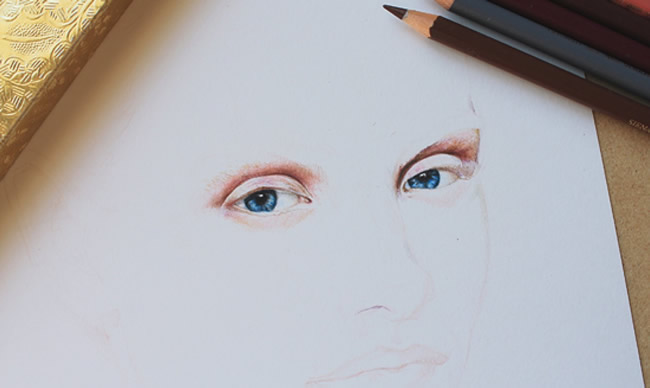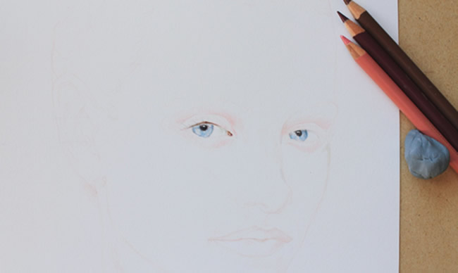 Slowly begin to move away from the eyes, shading the area under them and around the nose with darker shadows. Stick to the colors you used for the eyes. Depending on the subject, you can include some red for the cheeks. Burnt ocher is also a good way to balance out some of the pink from the medium-flesh and cinnamon-colored pencils.