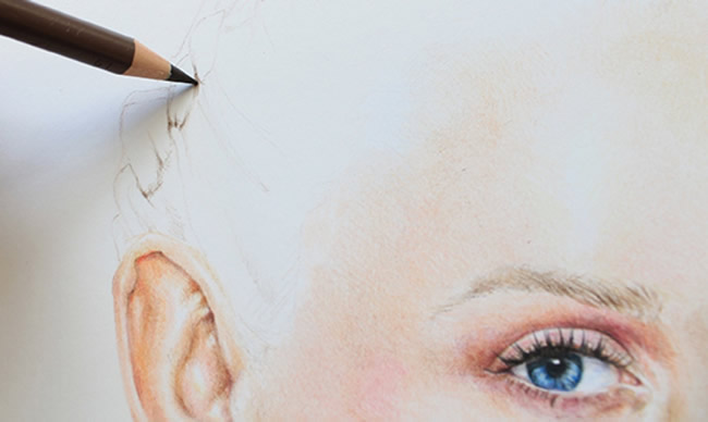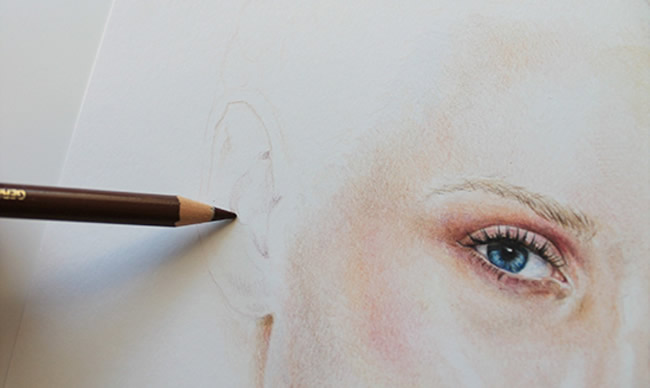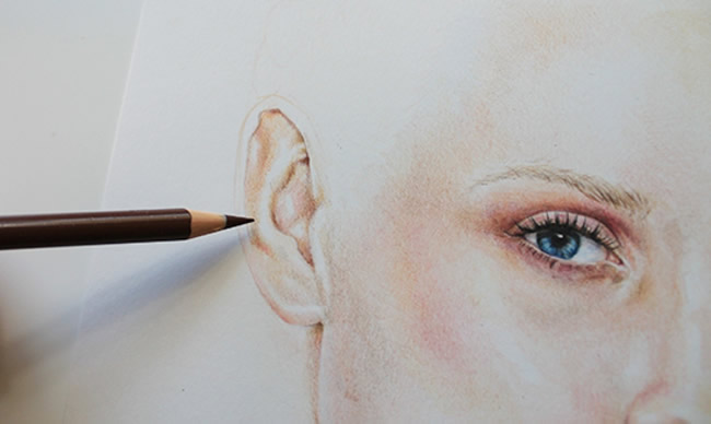 Here you can see the step-by-step layering process. Paint the dark areas of the ear with a dark brown pencil. Lay down the color in soft strokes, without pressing down too hard. These shadows should remain faint, since you’ll be adding color later.