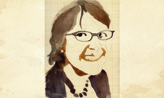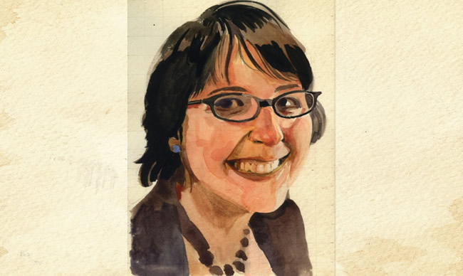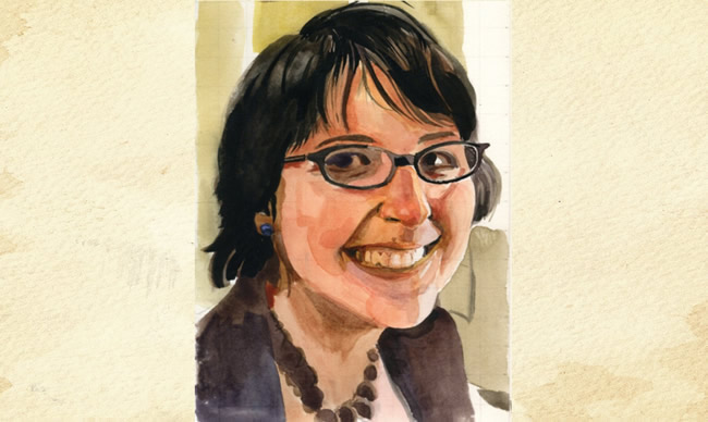 After laying down your lighter washes, it’s easier to see where your first washes can be darker. Using a higher ratio of pigment to water, go back and re-establish the darkest values — in this case, the hair and glasses.
