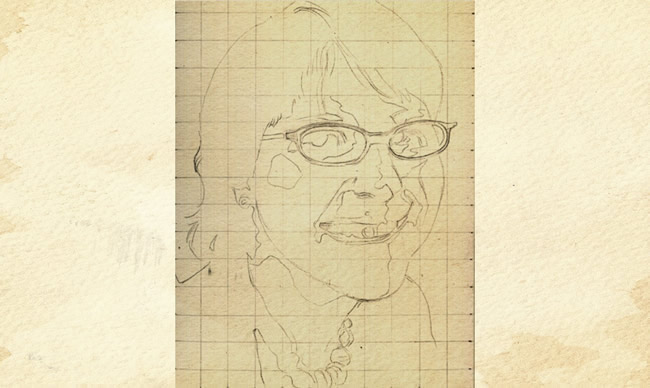 Here I’ve chosen a muted yellow-green as a complement to the warm tones in the face. The background wash can also serve to set off the highlights in a face, in this case the lower right, where the cheek had previously been hard to differentiate from the white background.